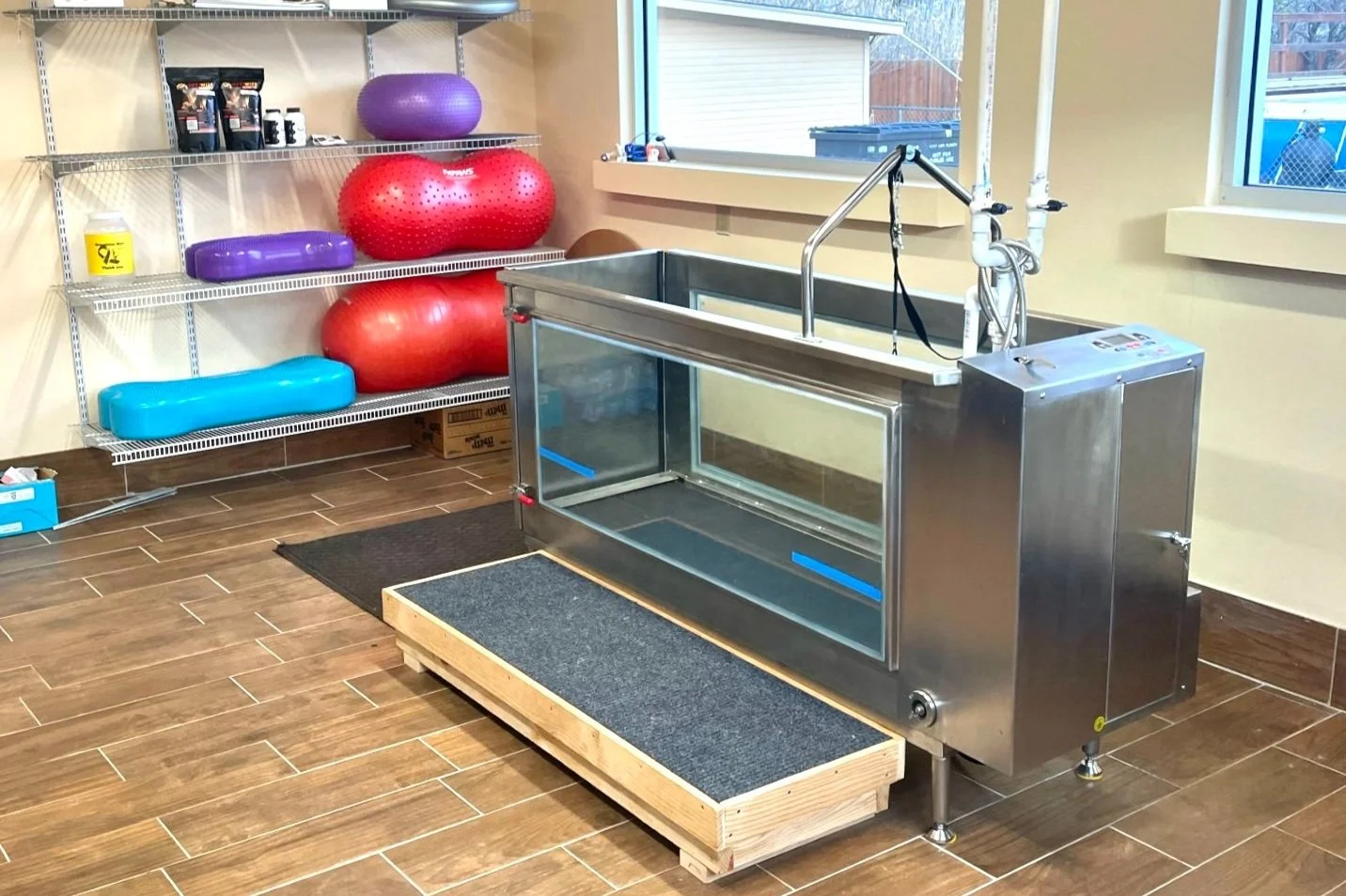 Canine hydrotherapy is a form of non-weight bearing exercise using key water properties to improve your pets range of motion and overall health. This type of therapy is often used for weightloss management without putting pressure on your dogs joints. It is also used for muscle building, cardiovascular health improvement, and post operative recovery to reduce pain and swelling.